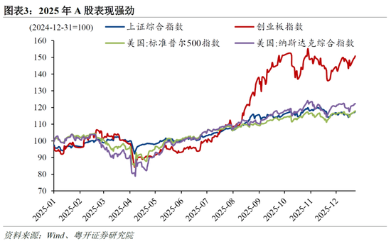 二是中国股市走强,人民币资产吸引力上升。前几年受国内房地产市场和股市持续低迷影响,人民币对美元汇率持续承压。但2024年926政治局会议以来,A股走出一轮科技突破和产业驱动、制度改革、资金流入和风险偏好提升共同推动下形成的“科技重估牛”。上证指数全年走势与美股不相上下,创业板指更是在三季度加速上涨,涨幅远超纳斯达克指数。外资机构对于中国资产的“ABC叙事”两极反转,从“Anything but China”(除了中国以外都能买)变为“AI BABA China”(人工智能、阿里巴巴、中国)。