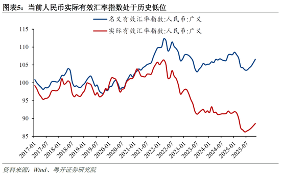 2024-2025年,人民币名义有效汇率指数高于疫情前水平,但由于国内物价持续低迷、海外通胀高企,人民币实际有效汇率显著低于疫情前水平。因此近两年中国出口保持较高增速,除了中国出口相关产业本身强大的国际竞争力以外,人民币实际有效汇率较低也是重要助力。