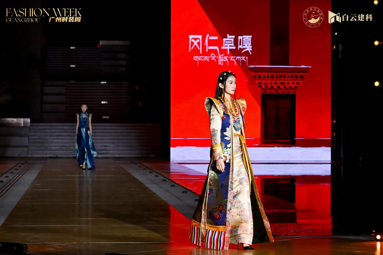 在本次广州时装周上,冈仁卓嘎以“雪域·回响”为主题,尝试从藏地哲学中“人与自然共生”的观念出发,解读传统藏服的形式结构。设计不追求视觉冲击的外显张扬,而强调一种“静谧的震撼”——克制却深远,庄重而富有精神张力。
