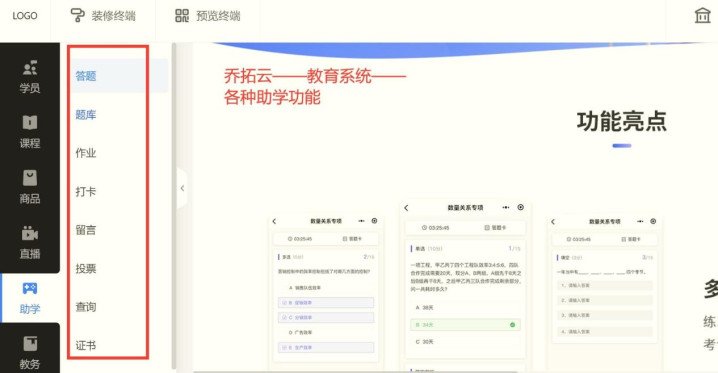 A3:需重点关注工具的场景适配性。艺术机构可优先选择支持作品可视化展示(图片、视频归档)的工具,如乔拓云的内容展示模块、校满满的教学成果展示功能,方便线上线下同步呈现教学效果;文化课机构可侧重题库、答题系统等助学功能,乔拓云高级版的3万题库、在线答题模块更适配,能兼顾线上课后巩固与线下课堂辅助;职业技能机构若有个性化流程需求,可考虑唯顿的定制化方案,确保工具匹配专属业务场景。